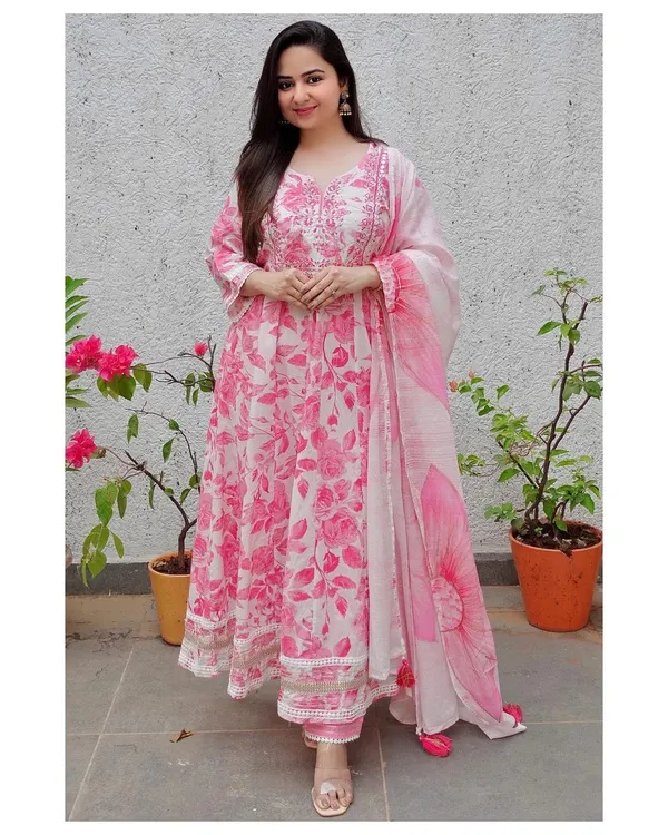 Pink Anarkali Floral Printed kurti with Pant and Dupatta Set